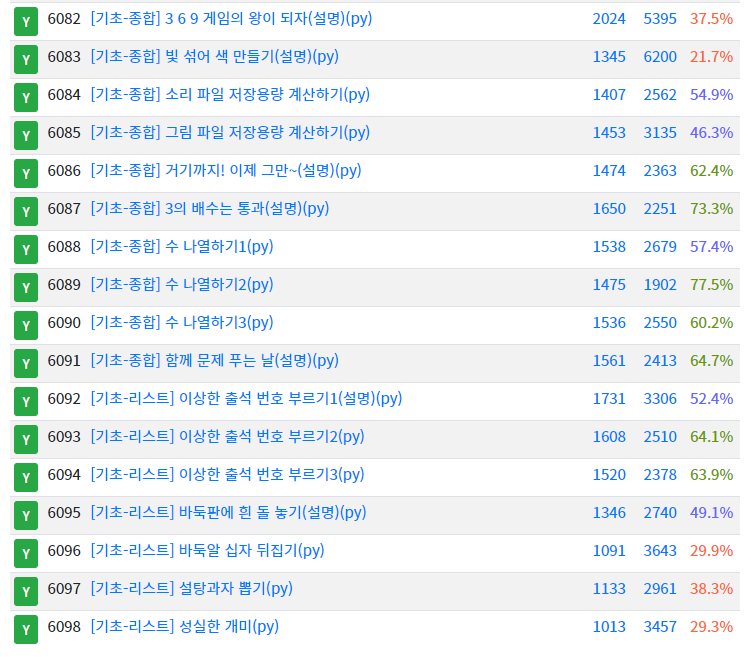이틀 정도에 나눠서 100문제 풀었다. 아무리 쉬운 문제여도 100문제는 적지 않긴 하다. 뒤로 갈수록 그래도 풀만한 문제들이 많았고, 앞부분 문제도 간단하게 파이썬 문법을 정리하기에 딱 좋은 난이도였다. 알고리즘은 전혀 다루지 않은 거라 그래프나 최단경로, 트리문제 풀려면 파이썬 버전 공부도 조금 필요하겠지만.. 이제 프로그래머스로 넘어가서 난이도를 조금씩 높여야겠다. 무엇보다도 자주 꾸준히 푸는 게 젤 중요하다! (●'◡'●)