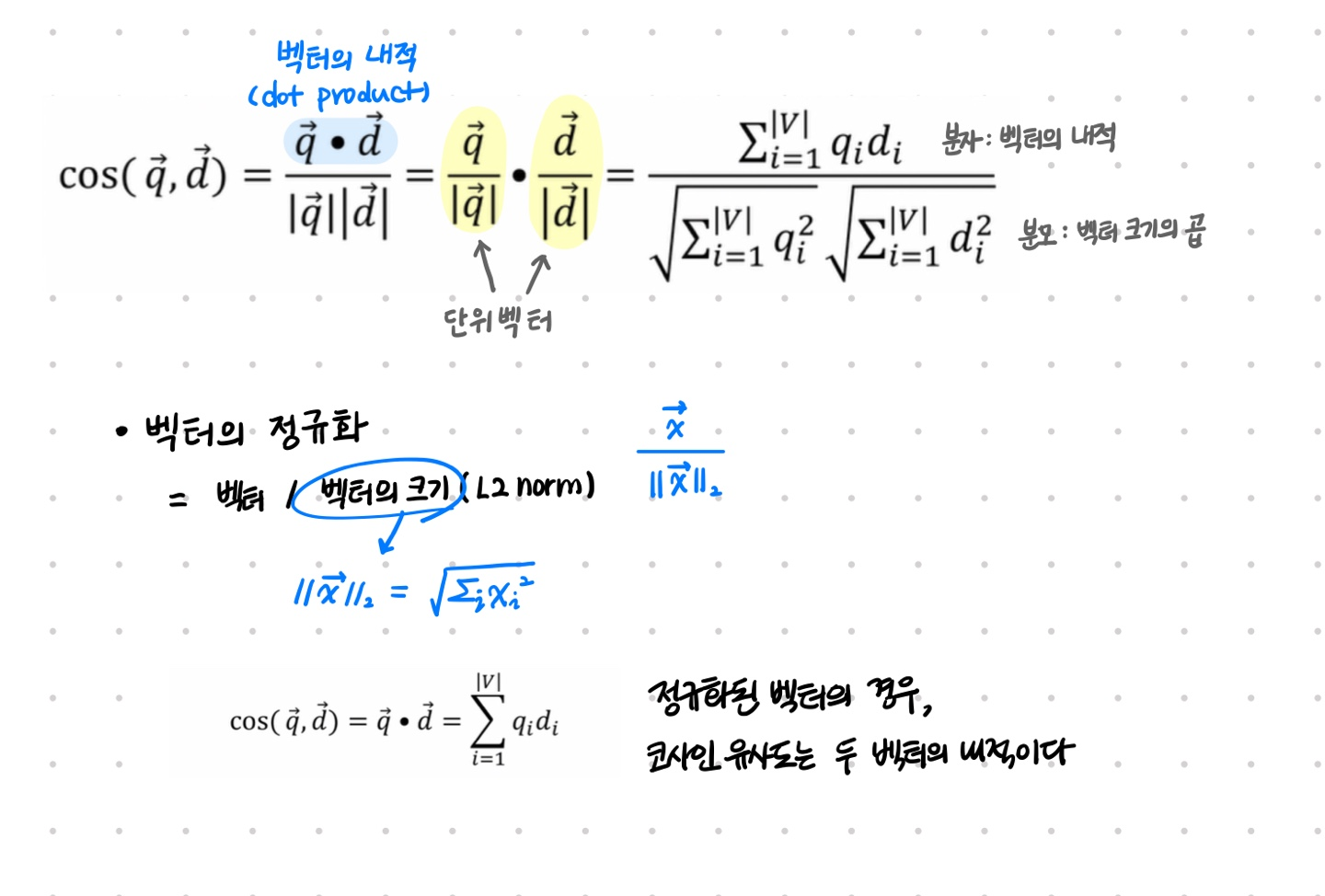 ๊ฐ ์ง์๋ ๋ฌธ์์ ์ฉ์ด ๋ฒกํฐ๋ ๋จ์๋ฒกํฐ๋ก ์ ๊ทํ๋๋ฉฐ ๋ฌธ์๊ฐ์ ์ ์ฌ๋๋ ์ฉ์ด ๋ฒกํฐ์ ์ฌ์ด ๊ฐ์ ์ฝ์ฌ์ธ์ผ๋ก ๊ณ์ฐ๋๋ค. ๋ ๋ฌธ์์ ๋ํ๋ ์ฉ์ด๋ค์ ์ ๊ทํ๋ ๋ถํฌ๊ฐ ์ ์ฌํ ์๋ก ๋ฌธ์๊ฐ ์ ์ฌํ ๊ฒ์ผ๋ก ๊ณ์ฐ๋๋ค. ๋ฌธ์์ ๊ธธ์ด๋ ๋ฌธ์์ ์ฝ์ฌ์ธ ์ ์ฌ๋์ ๋ฌด๊ดํ๋ค.