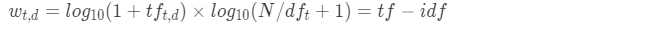- idf_t = log10(N/(df_t+1)), N์ ๋์ ๋ฌธ์ ์งํฉ์ ํฌ๊ธฐ-๋ฌธ์์ ์