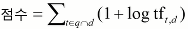 - ๋ฌธ์์งํฉ์ ๊ฐ ๋ฌธ์์ ๋ํ์ฌ ๊ทธ ๋ฌธ์์ ์ง์์ ๊ณตํต์ ์ผ๋ก ํฌํจ๋์ด ์๋ ์ฉ์ด์ ๋ํด tf-idf ๊ฐ์ค์น๋ฅผ ํฉ์ฐํ์ฌ ๊ด๋ จ๋๋ฅผ ๊ณ์ฐ