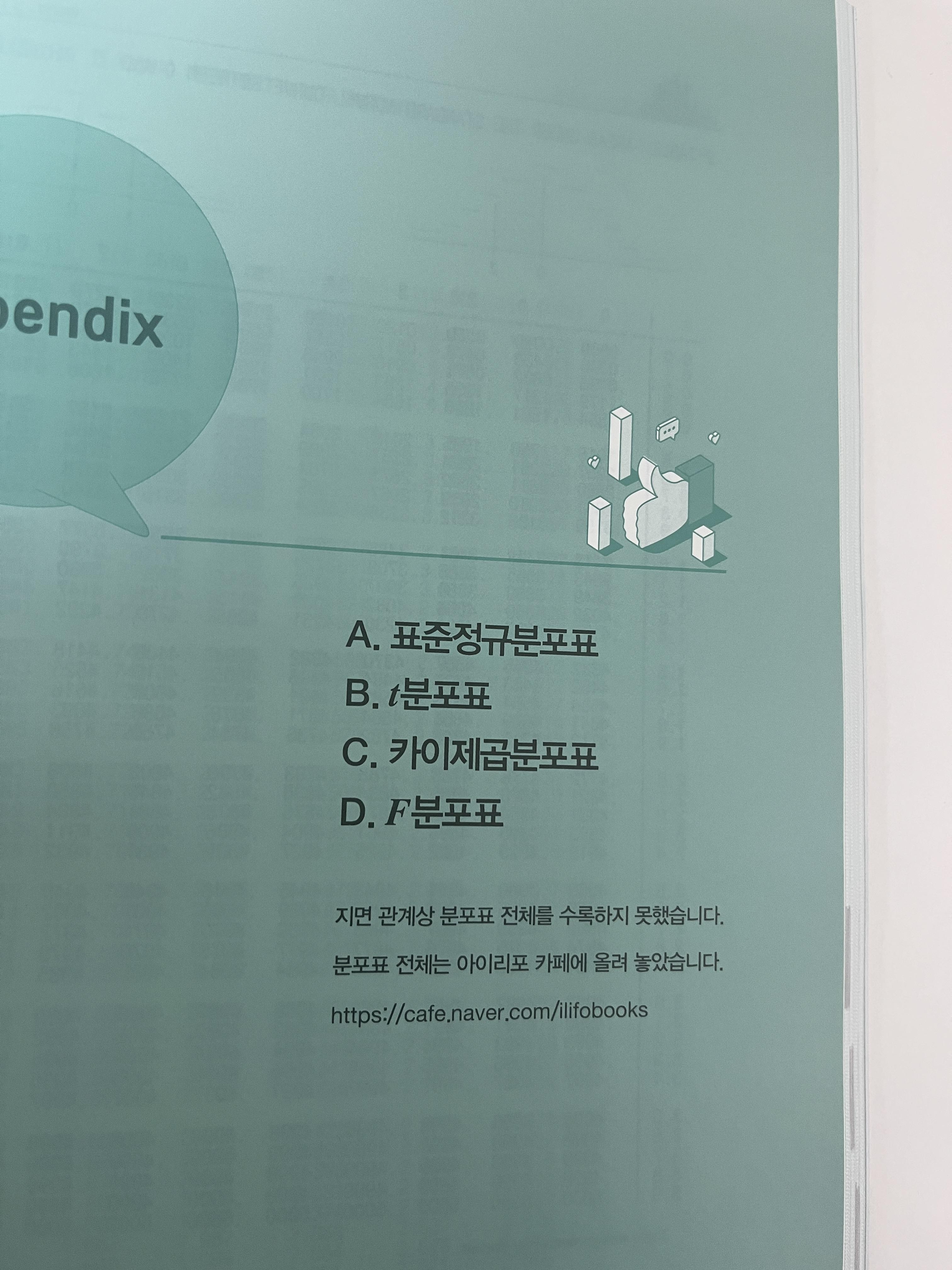 2권 마지막엔 Appendix를 제공한다. Z, T, F, 카이제곱 분포표가 일부 제공된다.